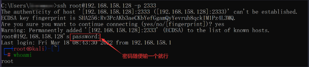这时候就能从 2333 端口,用 root 身份登入了( ssh root@192.168.158.128 -p 2333 ):