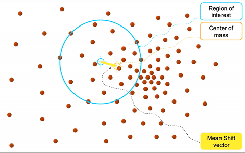 - 在中心点一定半径 ( ) 的区域内,计算每个数据与中心点偏移的均值 => 均值偏移